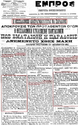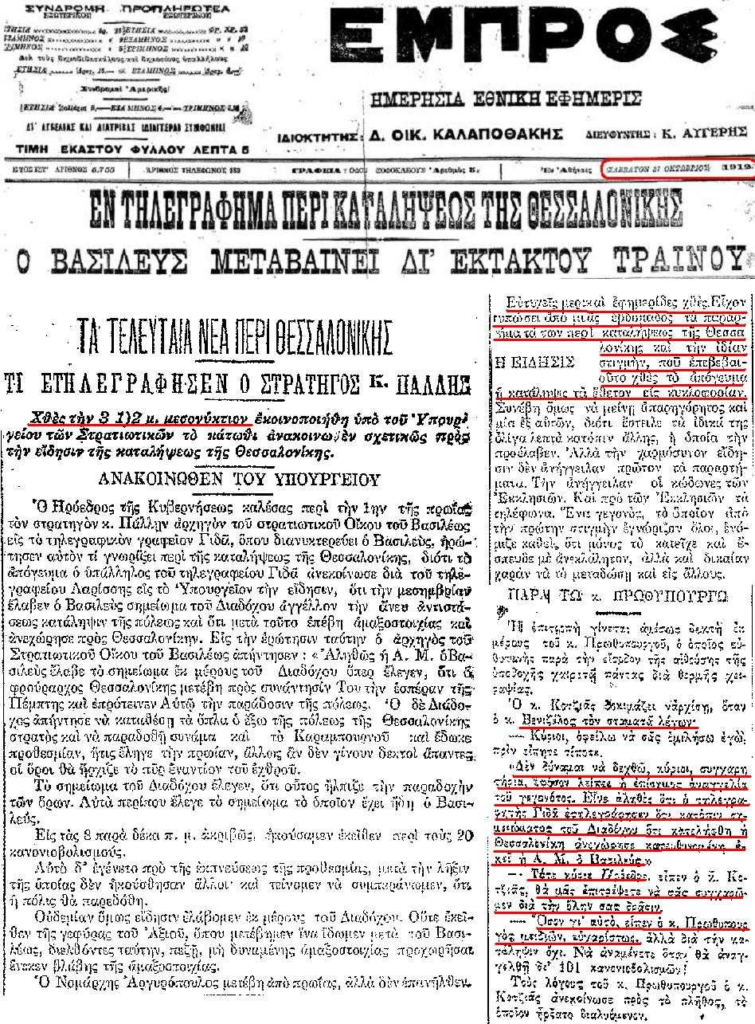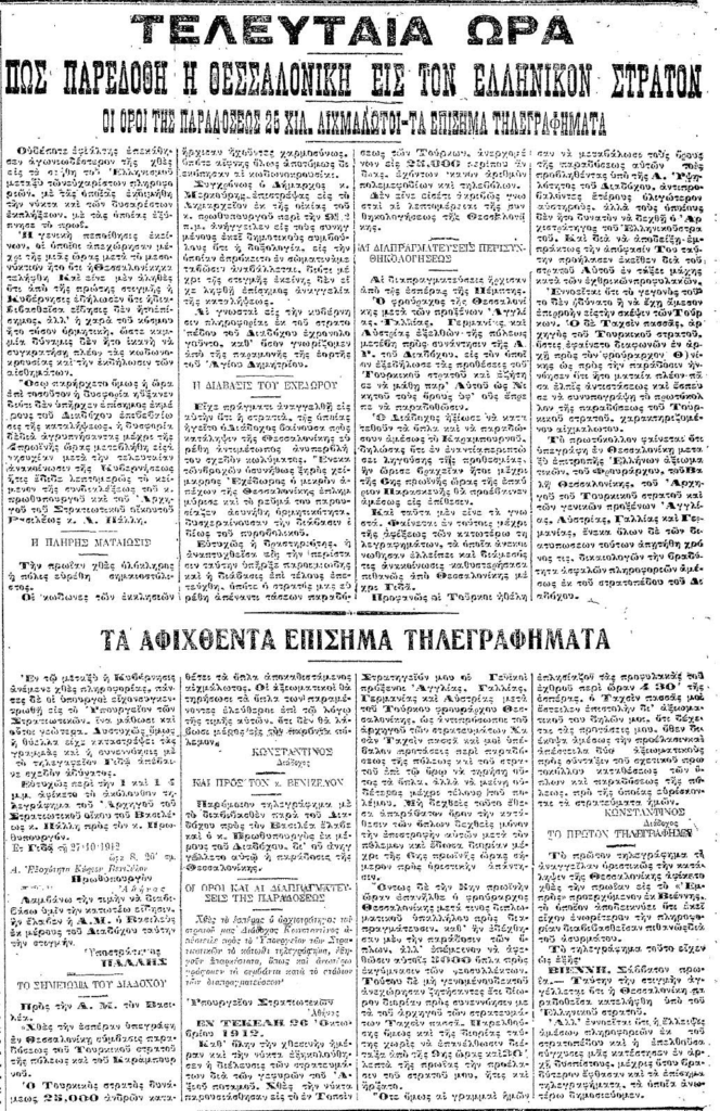 […] Ο Κωνστ·ντίνος εξουσιοδότησε τους αξιωματικούς του επιτελείου του Δούσμανην και Μεταξάν να μεταβούν εις Θεσσαλονίκην διά να υπογράψουν τα πρωτόκολλα της παραδόσεως. Αι σχετικαί διατυπώσεις έληξαν την 11 η νυκτερινήν.
