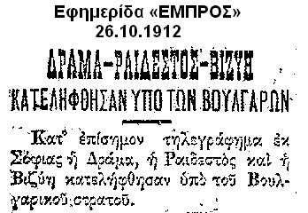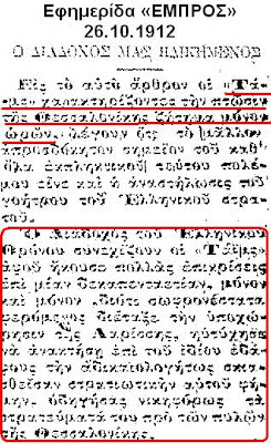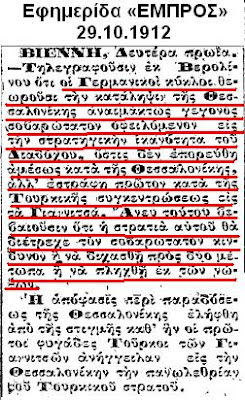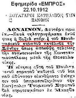 προς Κων/νο και του ζητάει να αποδεχθεί τούς όρους παράδοσης των Τούρκων και να τελειώνει, ενώ ξέρει ότι η πόλη έχει καταληφθεί…στις 27.10.1912 στις 8.20π.μ.