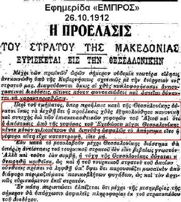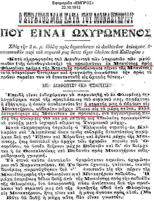 2. Στην Μακεδονία τότε πολεμούσαν δύο στρατιές. Η μία κατευθύνονταν μέσω Κατερίνης, Βέροιας και Γιαννιτσών προς Θεσσαλονίκη και η άλλη μέσω Φλώρινας προς ΜοναστήριΆρα ο Στρατός κινούνταν ταυτόχρονα σε δύο μέτωπα και δεν υπήρχε περίπτωση ο Κων/νος να βαδίσει προς Μοναστήρι κλπ. ανοησίες. Απόδειξη αυτού και το απόκομμα εφημερίδας της εποχής που περιγράφει τις μάχες που διεξάγονταν στην περιοχή της Φλώρινας, τις μέρες της κατάληψης της Θεσσαλονίκης.