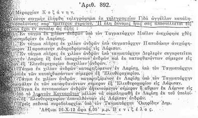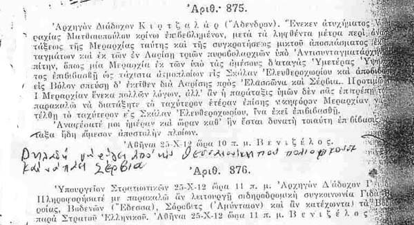 Στις 26.10.1912 στις 4:05μ.μ. ο Βενιζέλος στέλνει τηλεγράφημα προς την V Μεραρχία Κοζάνης