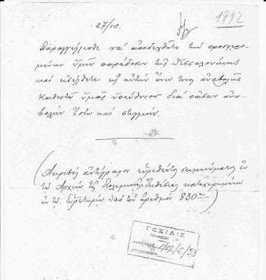 Αθήναι 27-Χ-12 ώρα 2.30′ π.μ. Πρωθυπουργός Βενιζέλος.