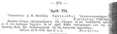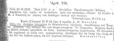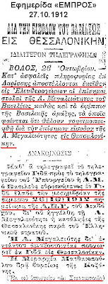 στο οποίο λέει «Ταύτην στιγμήν ελήφθη τηλεγράφημα εκ τηλεγραφείου Γιδά (Σ.Σ. εκεί ήταν το Αρχηγείο του Κων/νου) αγγέλον κατάληψιν Θεσσαλονίκης παρ’ ημετέρου στρατού…» άρα το απόγευμα της 26ης Οκτωβρίου ξέρει ότι η Θεσσαλονίκη έχει καταληφθεί. Μετά από 10 ώρες στις 27.10.1912, στις 2:30π.μ. στέλνει τηλεγράφημα (αρ.80200)
