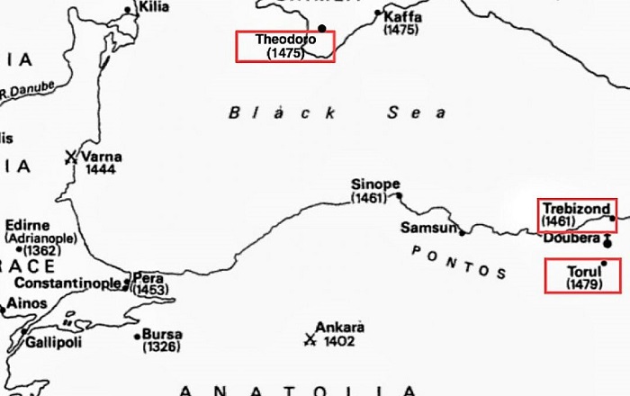 “The lord of “Torul” as well as the Georgian princes were protected and even incited by Uzun Hasan against the Ottomans. On Uzun Hasan’s death in 1478 it seems that Mehmed II thought it was time for him to complete his unfinished work on the eastern boundaries of the empire. He sent orders to his son, Bayezid (in Amasia), who had under his control all the territories as far as the Georgian border, to invade Torul and Georgia. The former was a tiny principality with a castle called Torul (today a nahiye with the same name) on the strategical mountain pass between Gümüshane and Trebizond. Under the protection of Uzun Hasan a local Greek lord maintained posession (…)” Halil Inalcik, “Mehmed the Conqueror (1432-1481) and His Time,” Speculum 35, no. 3 (Jul., 1960): 408-427