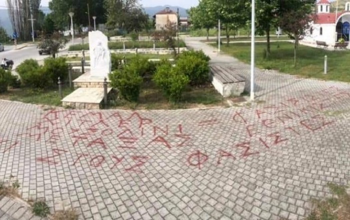 Οι άγνωστοι όπως φαίνεται και στη φωτογραφία έγραψαν στο πλακόστρωτο του μνημείου: ΚΕΜΑΛ – ΧΙΤΛΕΡ – ΜΟΥΣΟΛΙΝΙ – ΜΕΤΑΞΑΣ = ΦΑΣΙΣΤΕΣ ΕΘΝΙΚΙΣΤΕΣ