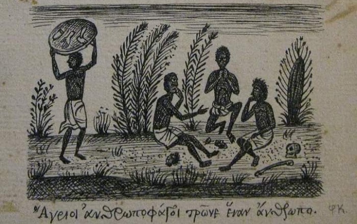 “Κανένα πράγμα δε φαίνεται στον άνθρωπο τόσο σιχαμερό όσο το να του πούνε να φάγει κρέας ανθρώπινο. Και μολαταύτα κάποιοι αγριάνθρωποι το τρώγανε και το τρώνε ακόμα με πολλή όρεξη και μάλιστα παραξενεύονται πως δεν το τρώνε κι οι ταξιδευτές που πάνε στον τόπο τους από την Ευρώπη.