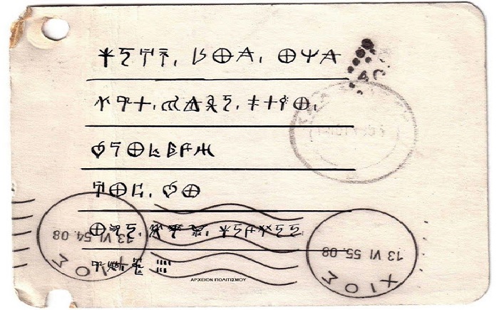 Η συγκεκριμένη εικόνα είναι από επιστολικό δελτάριο, που εστάλη από την Χίο, το 1954-1955, από τον Άγγλο καθηγητή κλασσικής φιλολογίας Τζων Τσάντγουικ (John Chadwick[2], 1920-1998) προς τον συνεργάτη του Μάικλ Βέντρις (1922-1956) Άγγλο γλωσσολόγο και αρχιτέκτονα, με τον οποίο συναποκρυπτογράφησαν την Γραμμική Β γραφή. Οι εργασίες τους απέδειξαν ότι η Γραμμική Β ήταν μια πρώιμη μορφή της ελληνικής, και όχι μιας κάποιας άλλης μεσογειακής γλώσσας…