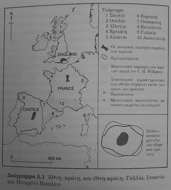 Συχνά οι διαφορετικές αυτές σημασίες συμπίπτουν. Έτσι, γεωπολιτικός πυρήνας για την Ισπανία είναι η Καστίλλη, η οποία απλώνεται στο κεντρικό οροπέδιο της χώρας. Ευρίσκεται ακριβώς στο μέσον της Ιβηρικής χερσονήσου, περιέχει την πρωτεύουσα Μαδρίτη, ενώ με βάση την Καστίλλη προωθήθηκε η έξωση των Μαυριτανών από την Ιβηρική και η ένωση των ισπανικών βασιλείων σε μία συγκεντρωτική επικράτεια. Για την Γαλλία, χώρα πρωτοπόρο στη γένεση του συγκεντρωτικού νεοτερικού κράτους στην Ευρώπη, πυρήνας είναι η περιοχή γύρω από το Παρίσι, και γενικά ο βορράς, από όπου έγινε η επέκταση των Φράγκων στην υπόλοιπη Γαλατία, και του οποίου η γλώσσα τελικώς επιβλήθηκε (langue d’ oil, έναντι της langue d’ oc του νότου).