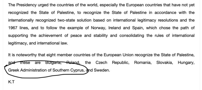 Είναι η πρώτη ίσως φορά, που το επίσημο παλαιστινιακό μέσο ενημέρωσης, αναφέρει την Κυπριακή Δημοκρατία σαν “ελληνική διοίκηση”, που σημαίνει πλήρη υιοθέτηση των τουρκικών θέσεων. Είναι προφανώς μάλλον πως η παλαιστινιακή αρχή “ανταποδίδει” την τουρκική υποστήριξη και δεν είναι η πρώτη φορά.