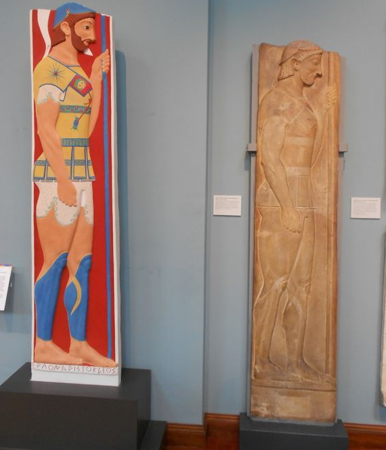 Η αναδημιουργία βασίστηκε στην ανάγλυφη στήλη καθώς και στο επιχρωματισμένο εκμαγείο της, όπως αυτό παρουσιάστηκε στην έκθεση με τίτλο “Έχρωμοι Θεοί – η πολυχρωμία των αρχαίων αγαλμάτων”στην οποία μαρμάρινα γλυπτικά έργα από την Αρχαία Ελλάδα παρουσιάστηκαν στην πρότερη έγχρωμη κατάστασή τους. Δημιουργός της έκθεσης είναι ο Γερμανός Κλασσικός Αρχαιολόγος Vinzenz Brinkmann ο οποίος από το 1980 ερευνά την πολυχρωμία των αγαλμάτων και το 2003, σε συνεργασία με τον διευθυντής της Γλυπτοθήκης του Μονάχου Raimund Wünsche, εγκαινίασε την ομώνυμη έκθεση στο Μόναχο.