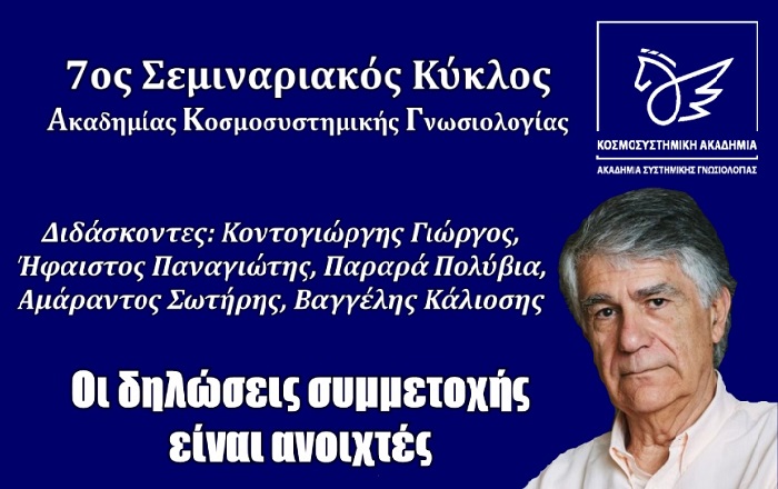 Η Ακαδημία Κοσμοσυστημικής Γνωσιολογίας, κατόπιν των έξι πρώτων επιτυχημένων κύκλων, ανακοινώνει την έναρξη του 7ου Κύκλου Σεμιναρίων (σειρά 9 μαθημάτων) που οργανώνονται με αντικείμενο την Κοσμοσυστημική Γνωσιολογία και βασικό εισηγητή τον θεμελιωτή της, Καθηγητή Γιώργο Κοντογιώργη. Στο σεμινάριο θα συμμετάσχουν επίσης ως διδάσκοντες οι καθηγητές Παναγιώτης Ήφαιστος, Πολυβία Παραρά, ο Δρ. Σωτήρης Αμάραντος και ο συγγραφέας – εκπαιδευτικός Βαγγέλης Κάλλιοσης.