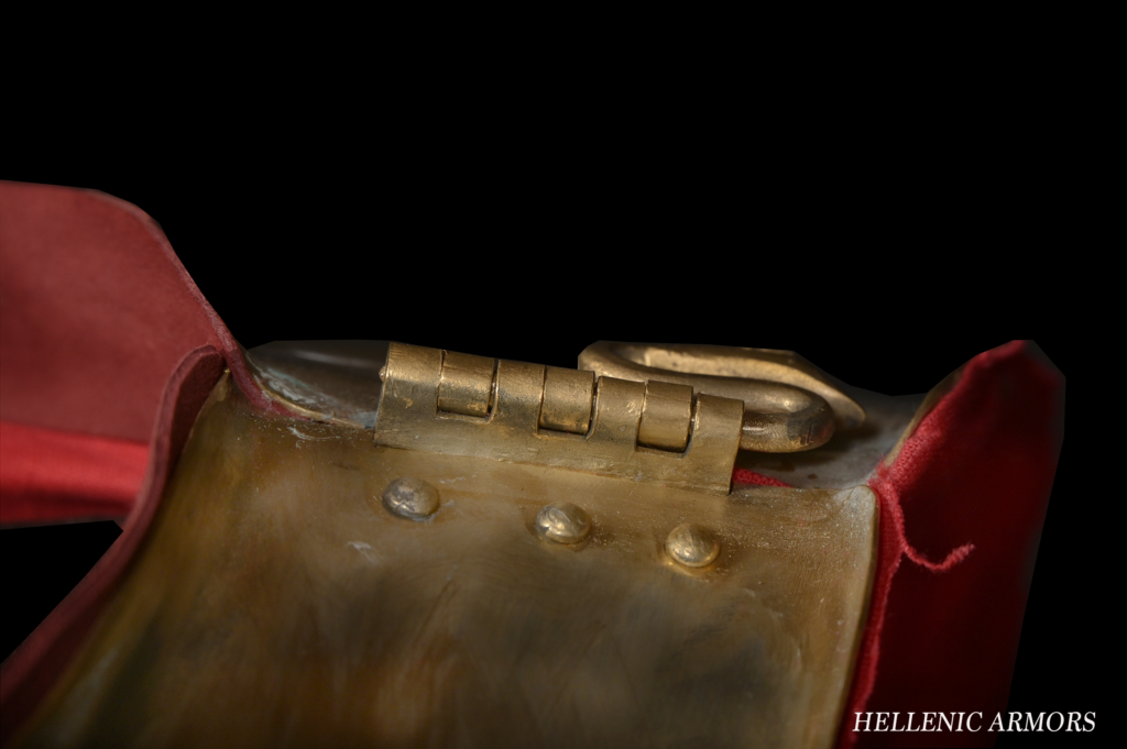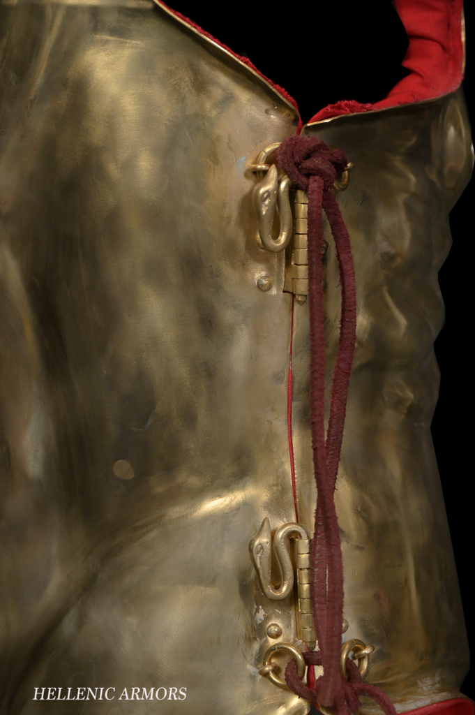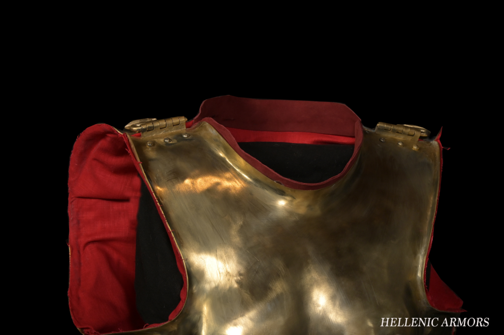 Αποτελείται από δύο ημιθωράκια, το εμπρόσθιο και το οπίσθιο τα οποία ενώνονται με έξι ζευγάρια μεντεσέδων (δύο σε κάθε υπομασχάλια πλευρά και δύο στην περιοχή των ώμων αριστερά και δεξιά του λαιμού). Οι μεντεσέδες είναι στερεωμένοι στην θέση τους με στρογγυλοκέφαλα μπρούτζινα πριτσίνια ενώ την δεξιά πλευρά του εντοπίζονται και δύο ζεύγη από κρίκους πρόσδεσης. Οι πείροι τους είναι εξίσου μπρούτζινοι και φέρουν κεφαλή από χήνα ή πάπια. Τόσο το άνοιγμα του λαιμού όσο και των άκρων παρουσιάζουν μια χαρακτηριστική τριγωνική ανάπτυξη.