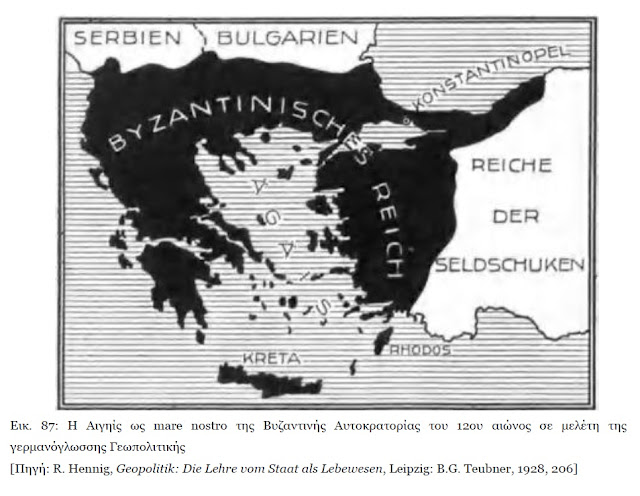 «Η υπερπόντια επέκταση στην απέναντι κειμένη ακτή αποτελεί θεματικό μοτίβο της πολιτικής όλων των ισχυρών κρατών, τα οποία εξασκούν την ναυσιπλοΐα. […] Ήδη από τις απαρχές της ιστορίας τους οι Έλληνες είχαν εδραιωθεί στην μικρασιατική ακτή. Ακόμη έως και την σύγχρονη περίοδο οι Έλληνες δεν έχουν εγκαταλείψει την επιδίωξή τους να ελέγξουν ολόκληρη την Αιγηίδα τουλάχιστον σε πολιτισμικό και οικονομικό επίπεδο, και ει δυνατόν σε πολιτικό επίπεδο, ώστε να την μετατρέψουν σε ίδια θάλασσα (mare nostro) ή, όπως έλεγαν ήδη στην αρχαιότητα, σε καθ’ ημάς θάλαττα. […] Προτού οι Τούρκοι εδραιωθούν στην περιοχή της Κωνσταντινουπόλεως κατά τους χρόνους των Σταυροφοριών, η Αιγηίς ήταν ίδια θάλασσα (mare nostro) του ελληνικού (βυζαντινού) αυτοκρατορικού κράτους, το οποίο περιέβαλλε σε μία σχεδόν πλήρη κυκλική μορφή το Αιγαίο Πέλαγος στον νότο (Κρήτη), στην δύση (Ελλάς), στον βορρά (Βυζάντιο) και στην Ανατολή (Μικρά Ασία) με μία βορειοανατολική προεξοχή στην Σινώπη».[8]