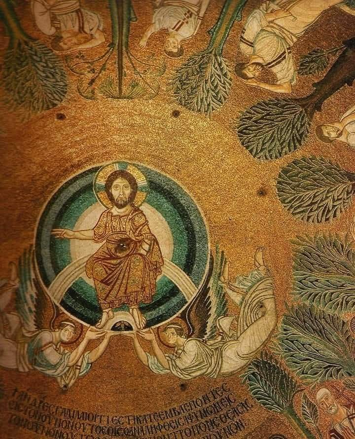Στη φωτό η Ανάληψη του Κυρίου στον τρούλο της Αγίας Σοφίας Θεσσαλονίκης. Ψηφιδωτό της Μακεδονικής Αναγέννησης του 9ου αιώνα.