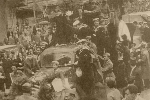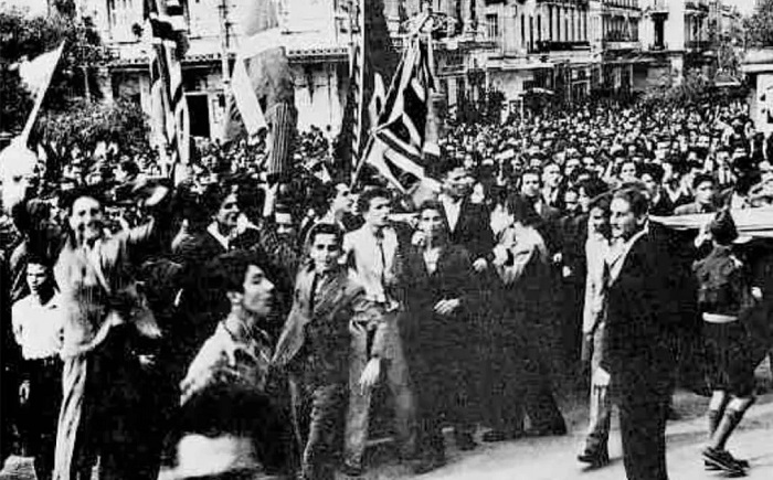 Στή γωνία Βουκουρεστίου καί Σταδίου μιά ἀρκετά μεγάλη διαδήλωση νέων ἔχει ἐπιτεθεῖ στα γραφεῖα τῆς Ala Litoria[2]. Σπάζουν τις πόρτες, μπαίνουν μέσα καί τά σπάνουν ὅλα, γεμίζουν το δρόμο μέ συντρίμμια καί χαρτιά. Το νεανικό πλῆθος φωνάζει καί γελᾶ. Αἰσθάνουμαι ὅτι μοῦ μεταδίδει τόν ἐνθουσιασμό του, φωνάζω καί ἐγώ καί γελῶ.