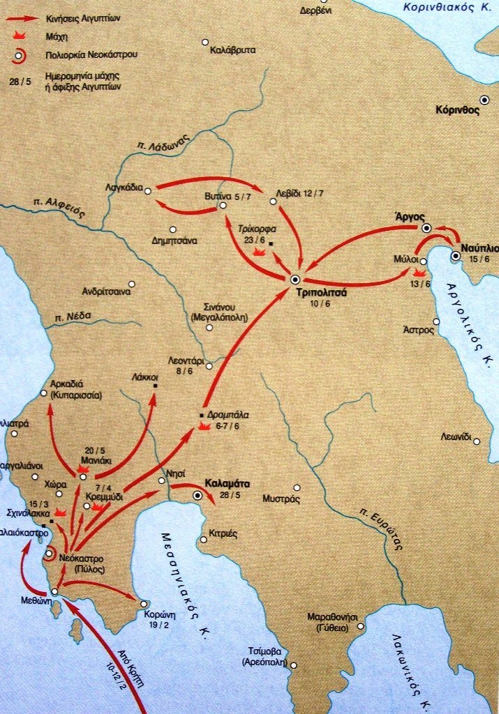 8 Οι Βακαλόπουλος, τόμος Ζ΄, σελ. 574 και Τρικούπης, τόμος Δ΄, σελ. 300 κάνουν αναφορά σε 40.000 συνολικά Αιγυπτίους που αποβιβάστηκαν στην Πελοπόννησο σε όλες τις φάσεις.