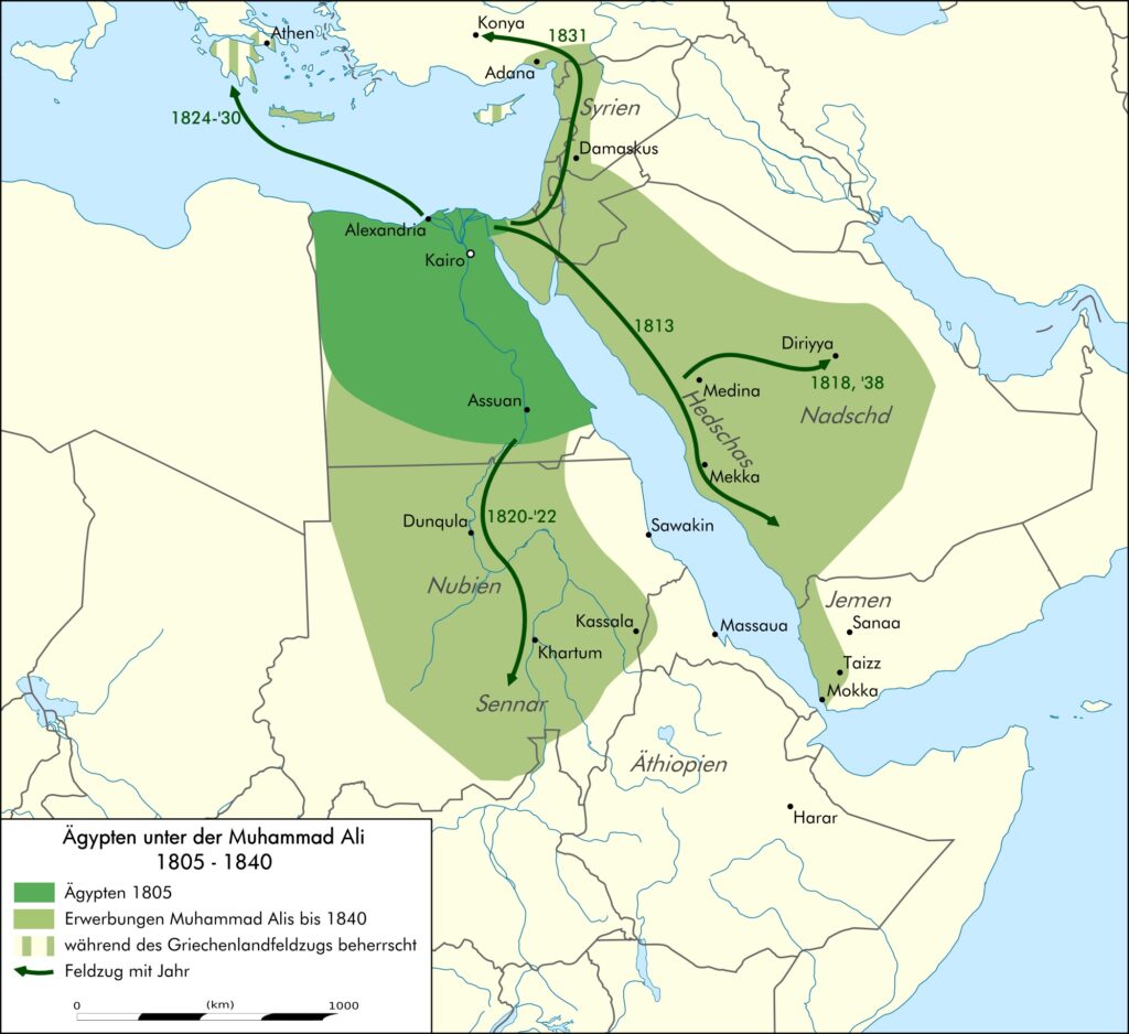 1 Η αιγυπτιακή εμπλοκή στην ελληνική Επανάσταση το 1821-1822 συνίστατο στην αποστολή μικρών ναυτικών μοιρών (καταστροφή του Γαλαξιδίου 23 Σεπτεμβρίου 1821) για ενίσχυση του σουλτανικού στόλου. Την περίοδο 1822-1823 μεταφέρθηκε τμηματικά 20.000 αιγυπτιακός στρατός στην Κρήτη για την καταστολή της Επανάστασης στο νησί. Τον Μάιο του 1824 οι Αιγύπτιοι κατέστρεψαν την Κάσο ενώ την περίοδο Ιουλίου-Νοεμβρίου 1824 εκστρατευτικό σώμα δυνάμεως 26.000 που επέβαινε στην τουρκοαιγυπτιακή αρμάδα αναχαιτίστηκε από τον ελληνικό στόλο στις μεγάλες ναυμαχίες (Σάμου, Κω-Αλικαρνασσού, Γέροντα, Μυτιλήνης, Ηρακλείου) υφιστάμενο απώλειες περίπου 8.000 ανδρών.