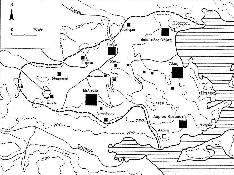 …καὶ ταύτῃ μὲν τῇ ἡμέρᾳ, ᾗ ἐκ τῆς Μελιτείας ἀφώρμησεν, ἐς Φάρσαλόν τε ἐτέλεσε καὶ ἐστρατοπεδεύσατο ἐπὶ τῷ Ἀπιδανῷ ποταμῷ, ἐκεῖθεν δὲ ἐς Φάκιον, καὶ ἐξ αὐτοῦ ἐς Περραιβίαν.