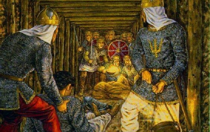 Μεσα σε αυτην, βρηκαν εναν ανθρωπινο σκελετο που φορουσε εναν αλυσιδωτο θωρακα τραβηγμενο μεχρι το υψος του θωρακα, ανασκελα, ενω αλλοι 3 ηταν πισω του. Μπροστα του, αλλα με φορα προς αυτον οι περισσοτεροι, ηταν αλλοι 18 σκελετοι. Ολοι σχεδον εφεραν πληγματα απο μικρα αγχεμαχα οπλα και μικρες αιχμες δορατων. Αλλοι, δεν ειχαν κανενα πληγμα ομως. Τελικα το 2001, οι αρχαιολογοι εμαθαν τι συνεβη: