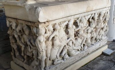 Εντυπωσιακή σαρκοφάγος με κάλυμμα διαμορφωμένο σε στρώμα κλίνης, πάνω στο οποίο ξαπλώνει το ζεύγος των νεκρών. Φέρει και στις τέσσερις…